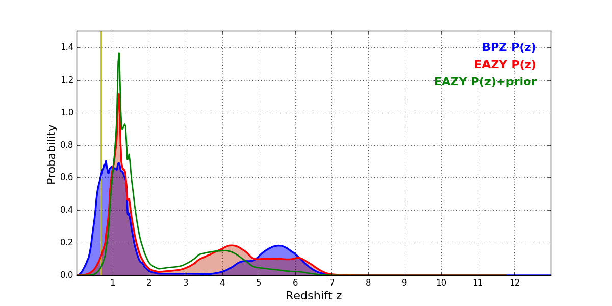 In P(z) plots: Yellow lines mark the cluster redshift z = 0.677,