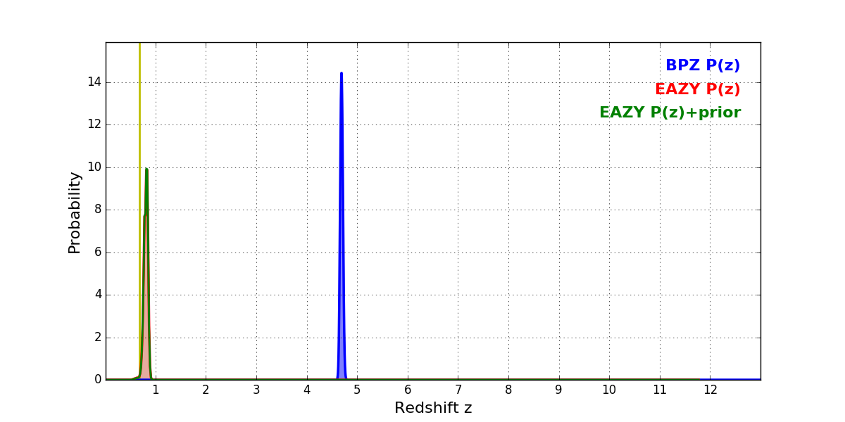 In P(z) plots: Yellow lines mark the cluster redshift z = 0.677,