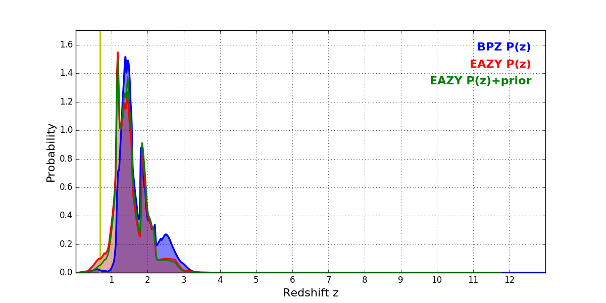 In P(z) plots: Yellow lines mark the cluster redshift z = 0.677,