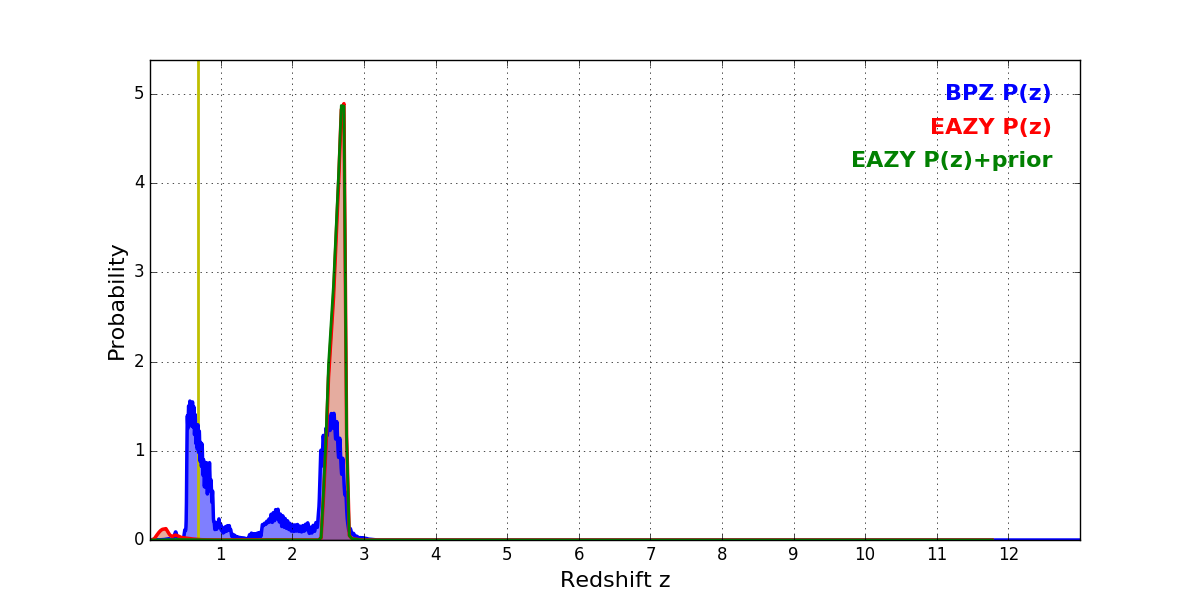 In P(z) plots: Yellow lines mark the cluster redshift z = 0.677,