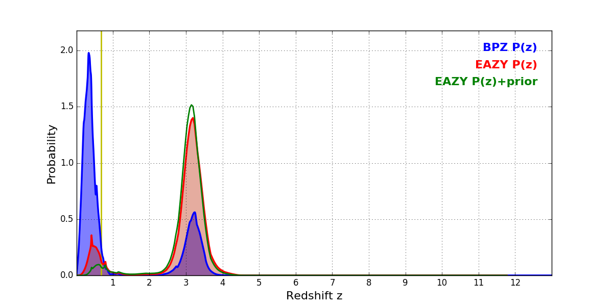 In P(z) plots: Yellow lines mark the cluster redshift z = 0.677,