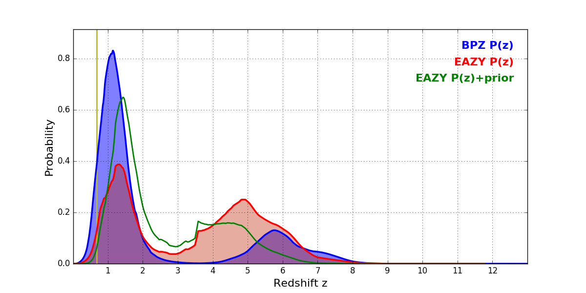 In P(z) plots: Yellow lines mark the cluster redshift z = 0.677,