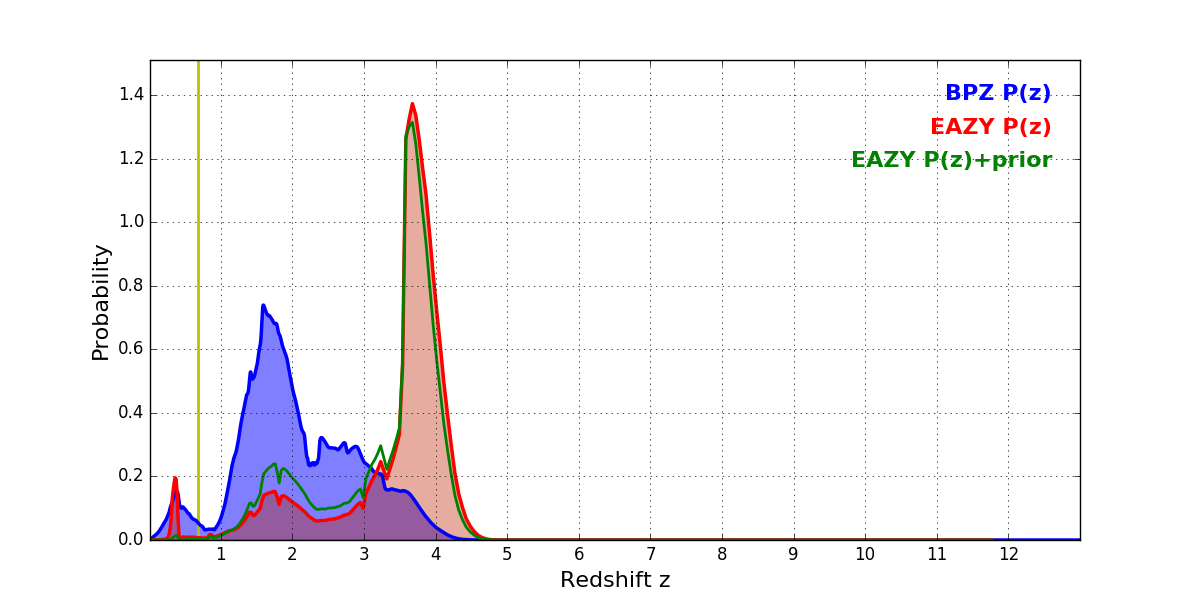 In P(z) plots: Yellow lines mark the cluster redshift z = 0.677,