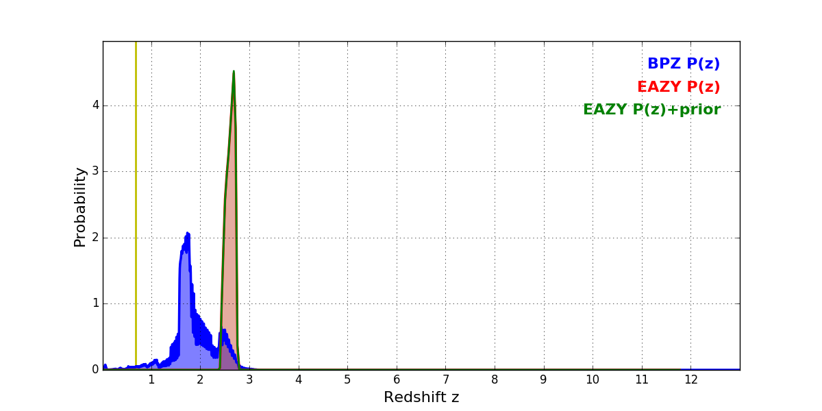 In P(z) plots: Yellow lines mark the cluster redshift z = 0.677,