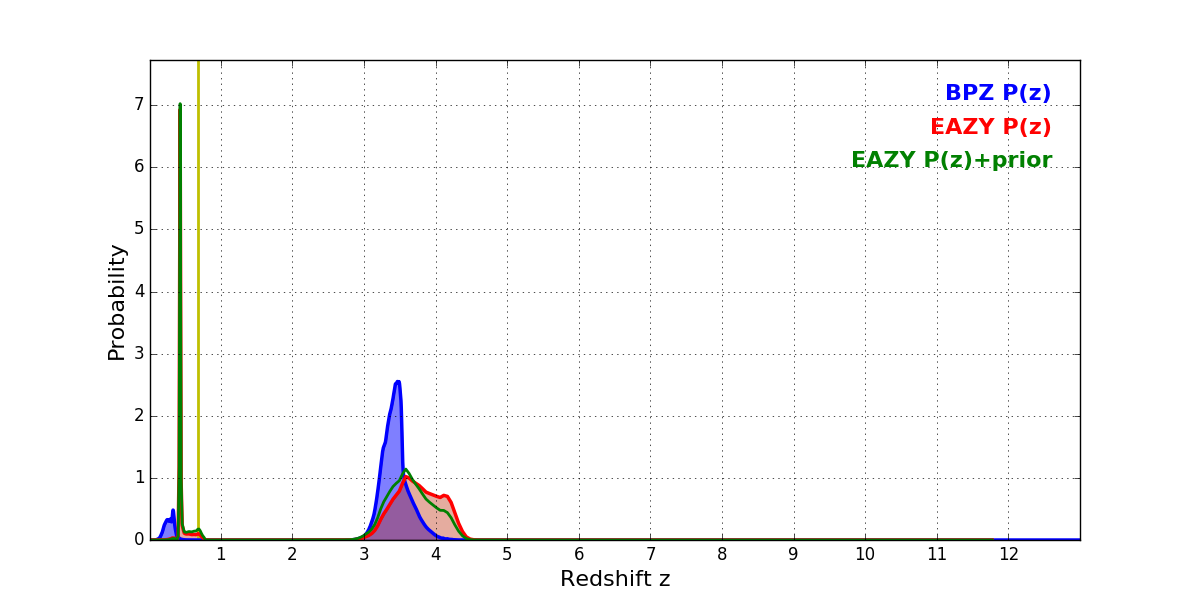 In P(z) plots: Yellow lines mark the cluster redshift z = 0.677,
