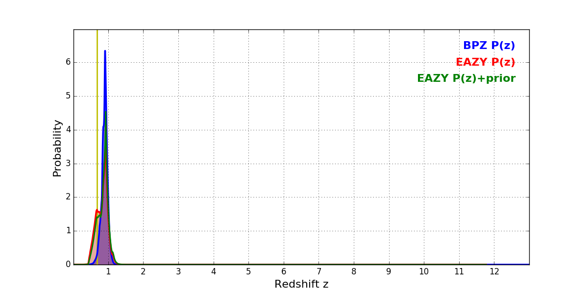 In P(z) plots: Yellow lines mark the cluster redshift z = 0.677,