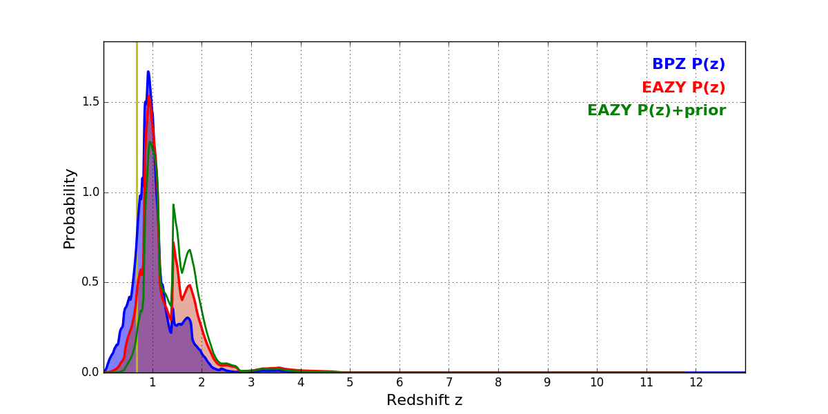 In P(z) plots: Yellow lines mark the cluster redshift z = 0.677,
