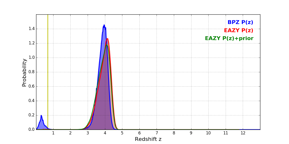 In P(z) plots: Yellow lines mark the cluster redshift z = 0.677,