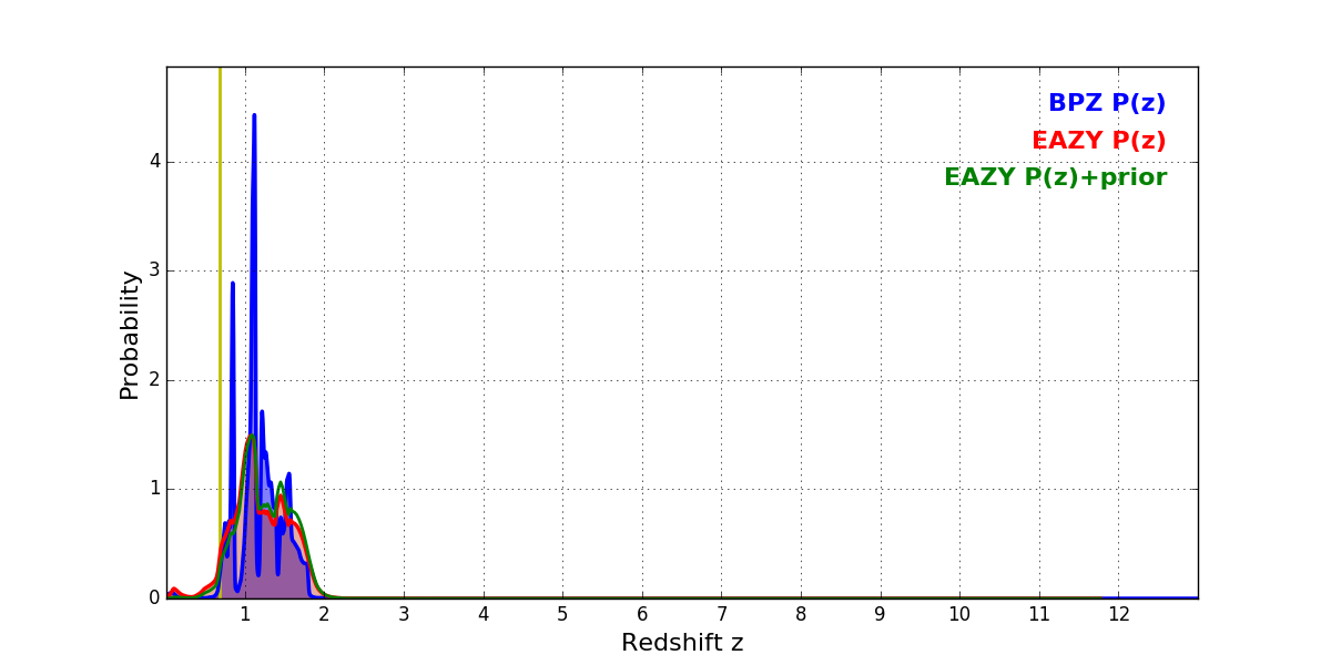 In P(z) plots: Yellow lines mark the cluster redshift z = 0.677,
