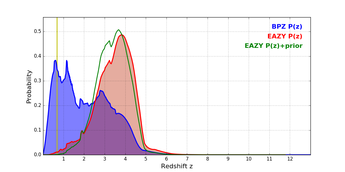In P(z) plots: Yellow lines mark the cluster redshift z = 0.677,