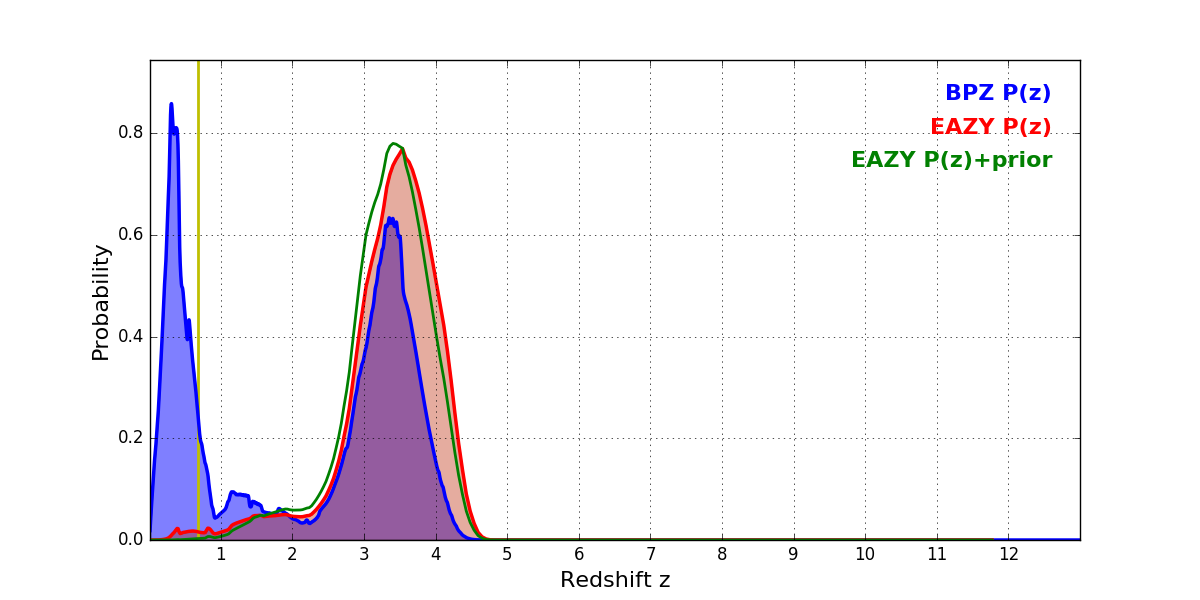 In P(z) plots: Yellow lines mark the cluster redshift z = 0.677,