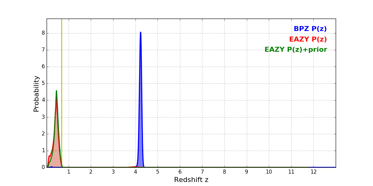In P(z) plots: Yellow lines mark the cluster redshift z = 0.677,