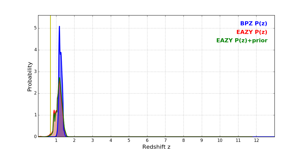 In P(z) plots: Yellow lines mark the cluster redshift z = 0.677,