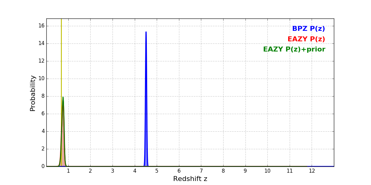In P(z) plots: Yellow lines mark the cluster redshift z = 0.677,