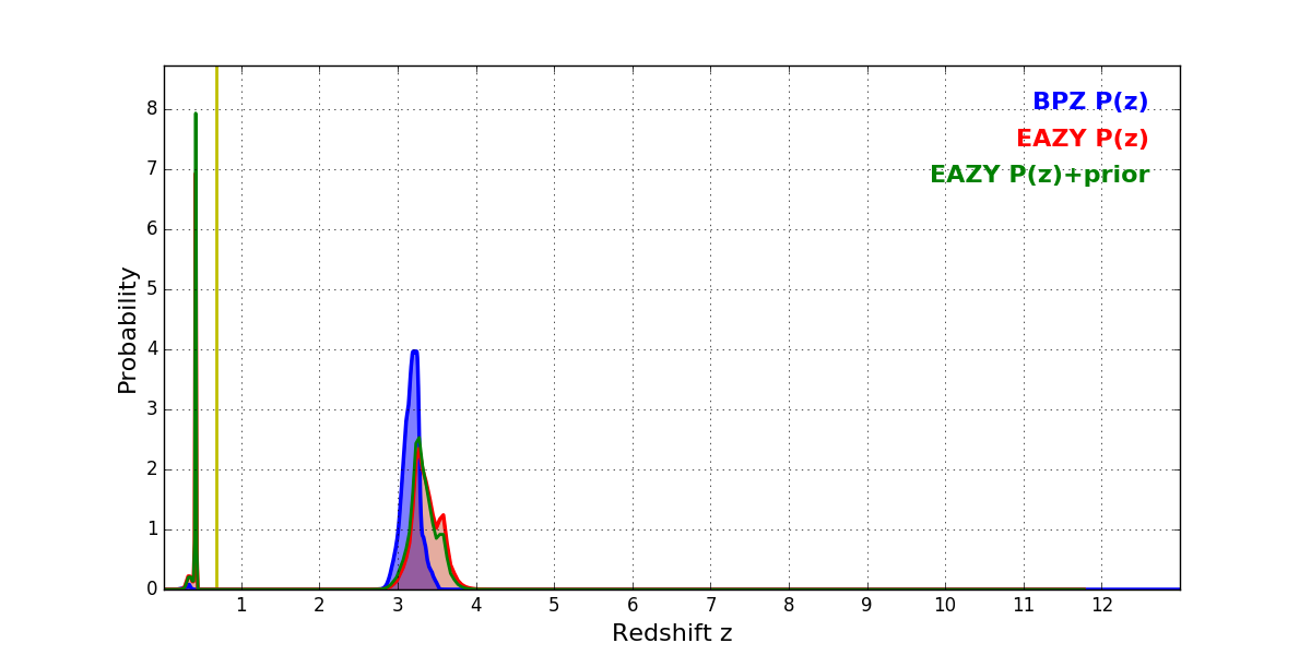In P(z) plots: Yellow lines mark the cluster redshift z = 0.677,