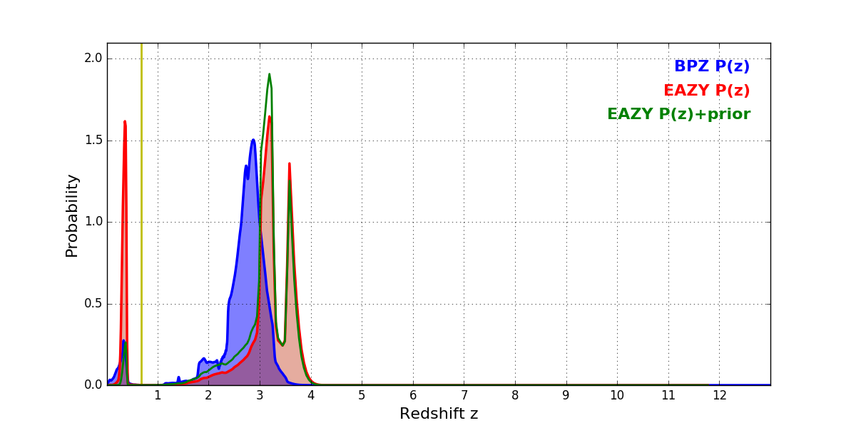 In P(z) plots: Yellow lines mark the cluster redshift z = 0.677,