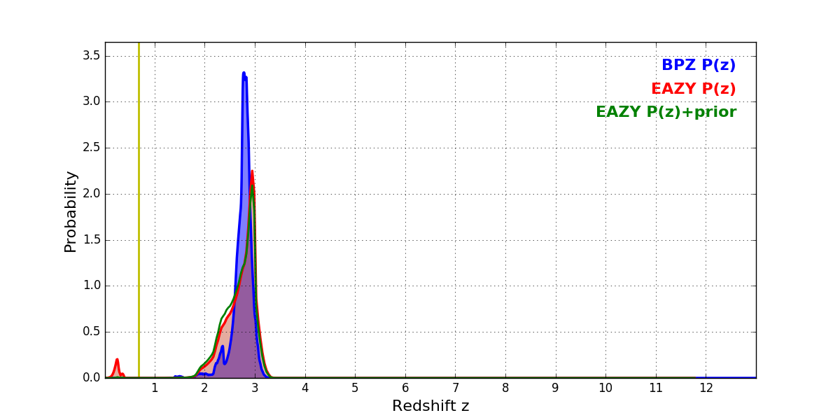 In P(z) plots: Yellow lines mark the cluster redshift z = 0.677,