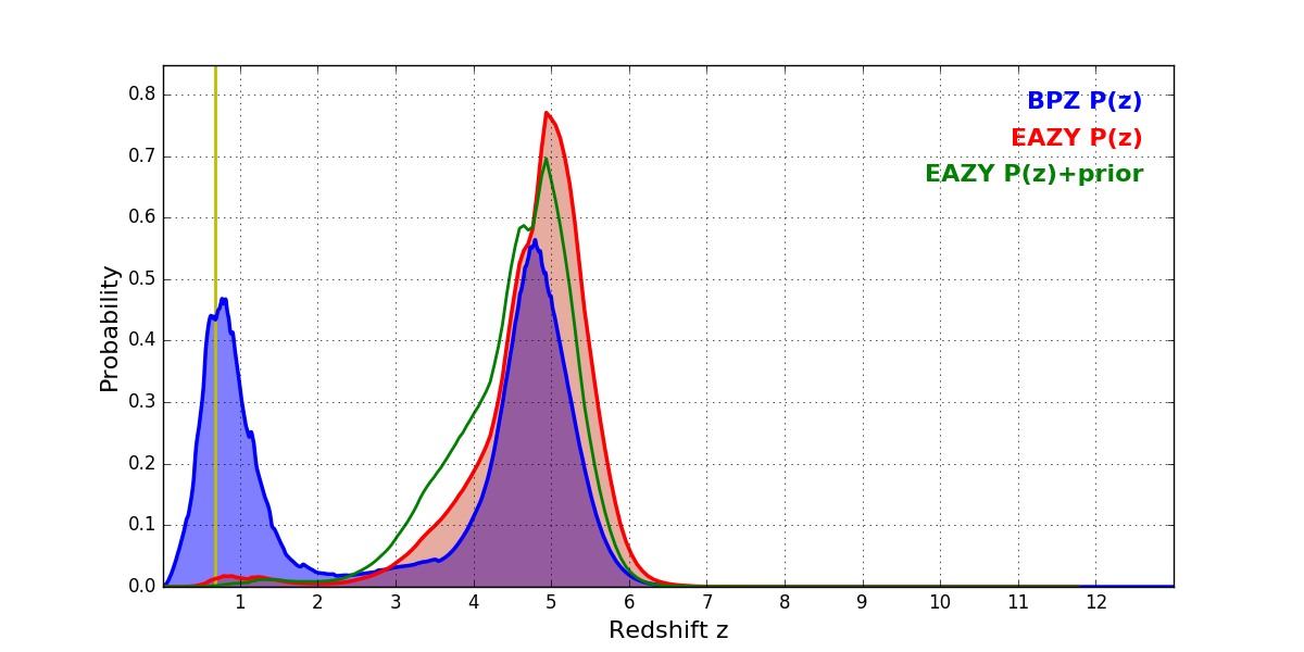 In P(z) plots: Yellow lines mark the cluster redshift z = 0.677,