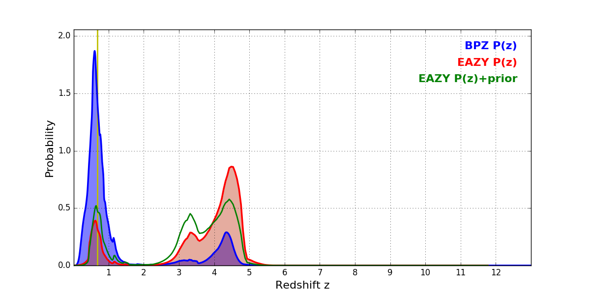 In P(z) plots: Yellow lines mark the cluster redshift z = 0.677,