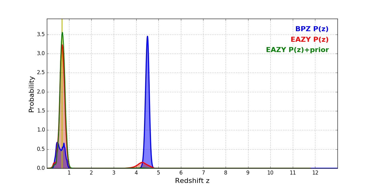 In P(z) plots: Yellow lines mark the cluster redshift z = 0.677,