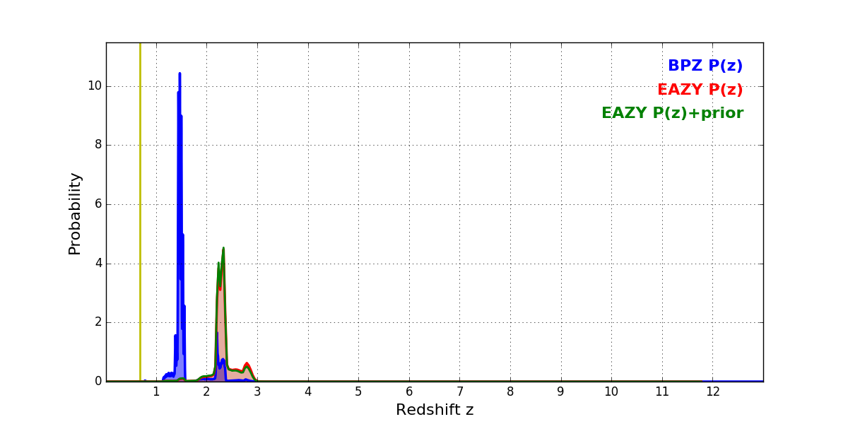 In P(z) plots: Yellow lines mark the cluster redshift z = 0.677,