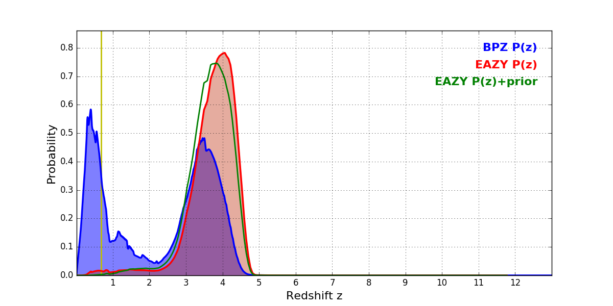 In P(z) plots: Yellow lines mark the cluster redshift z = 0.677,