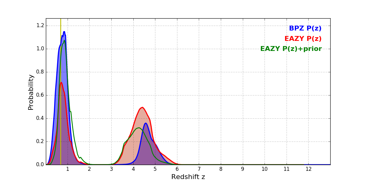 In P(z) plots: Yellow lines mark the cluster redshift z = 0.677,