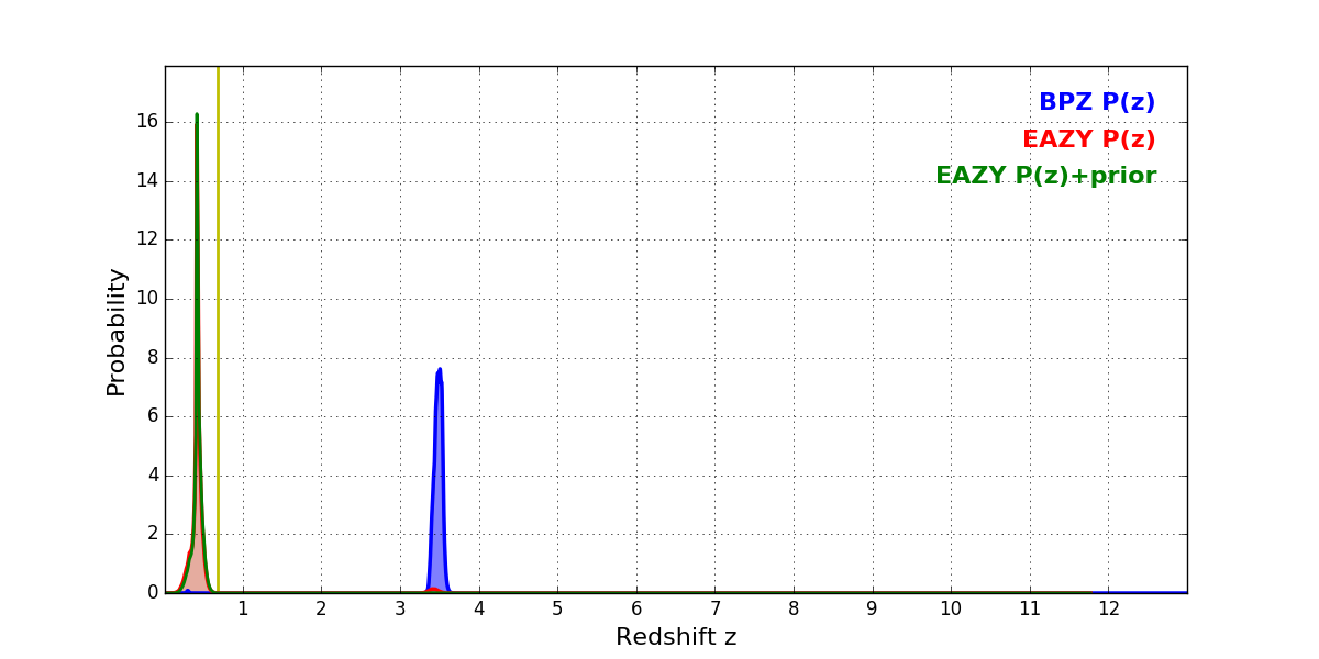 In P(z) plots: Yellow lines mark the cluster redshift z = 0.677,