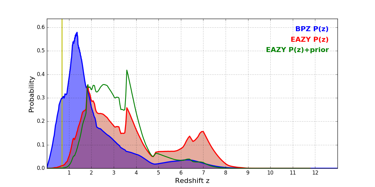 In P(z) plots: Yellow lines mark the cluster redshift z = 0.677,