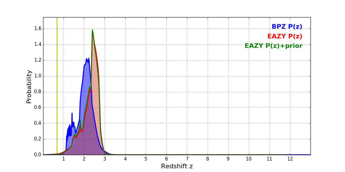 In P(z) plots: Yellow lines mark the cluster redshift z = 0.677,