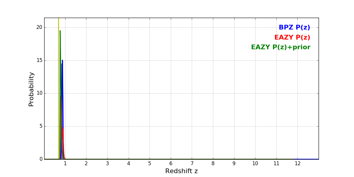 In P(z) plots: Yellow lines mark the cluster redshift z = 0.677,
