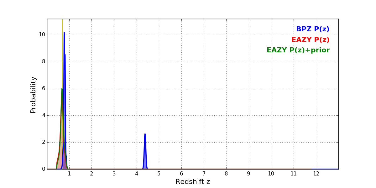 In P(z) plots: Yellow lines mark the cluster redshift z = 0.677,