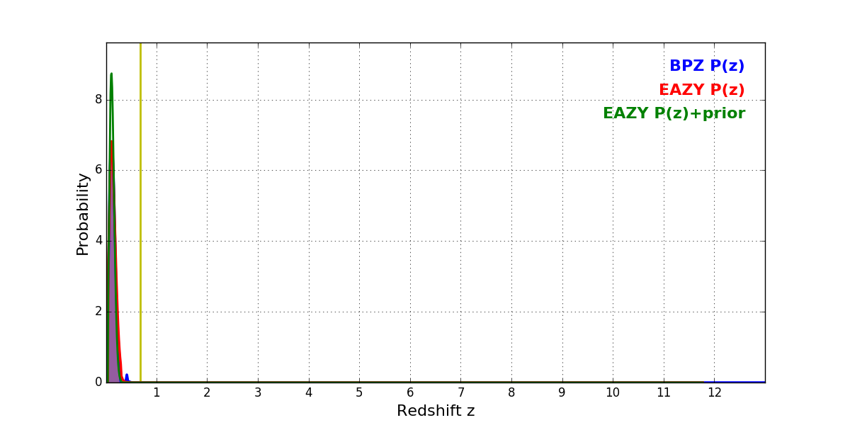 In P(z) plots: Yellow lines mark the cluster redshift z = 0.677,