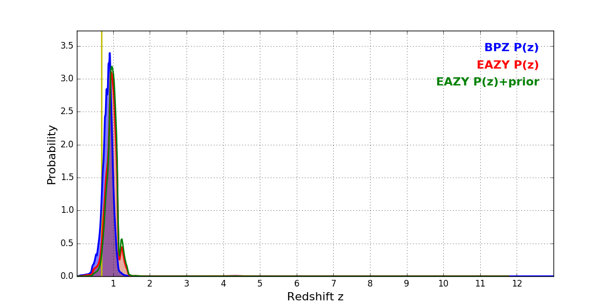 In P(z) plots: Yellow lines mark the cluster redshift z = 0.677,