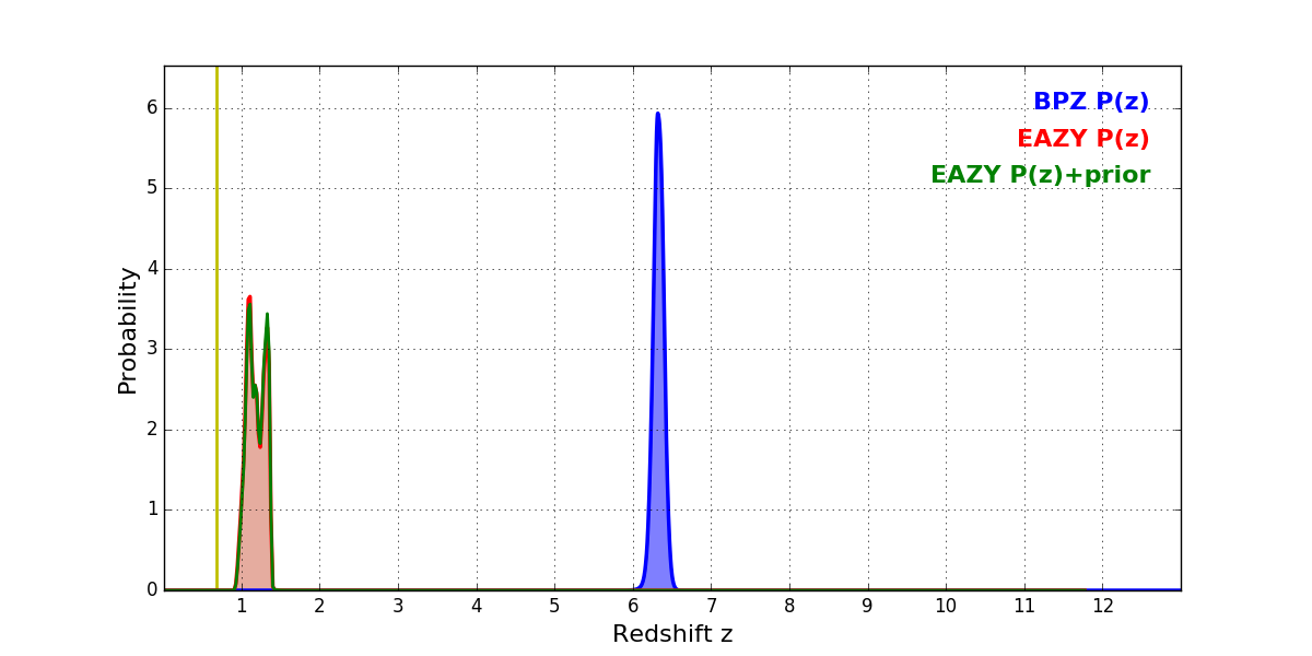 In P(z) plots: Yellow lines mark the cluster redshift z = 0.677,