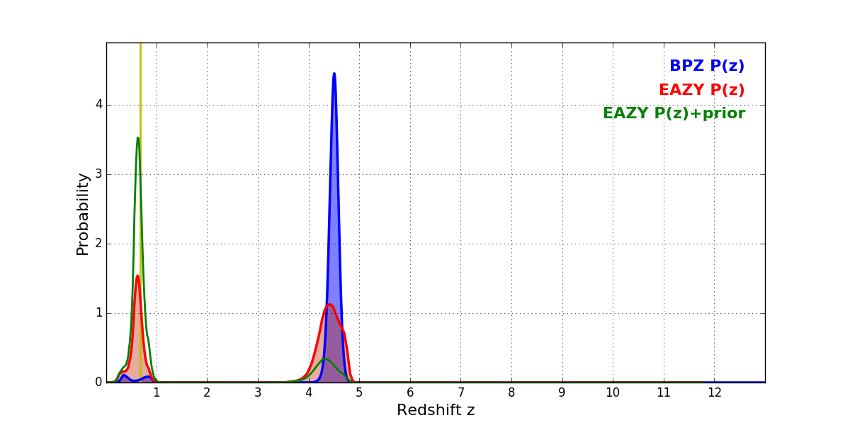 In P(z) plots: Yellow lines mark the cluster redshift z = 0.677,