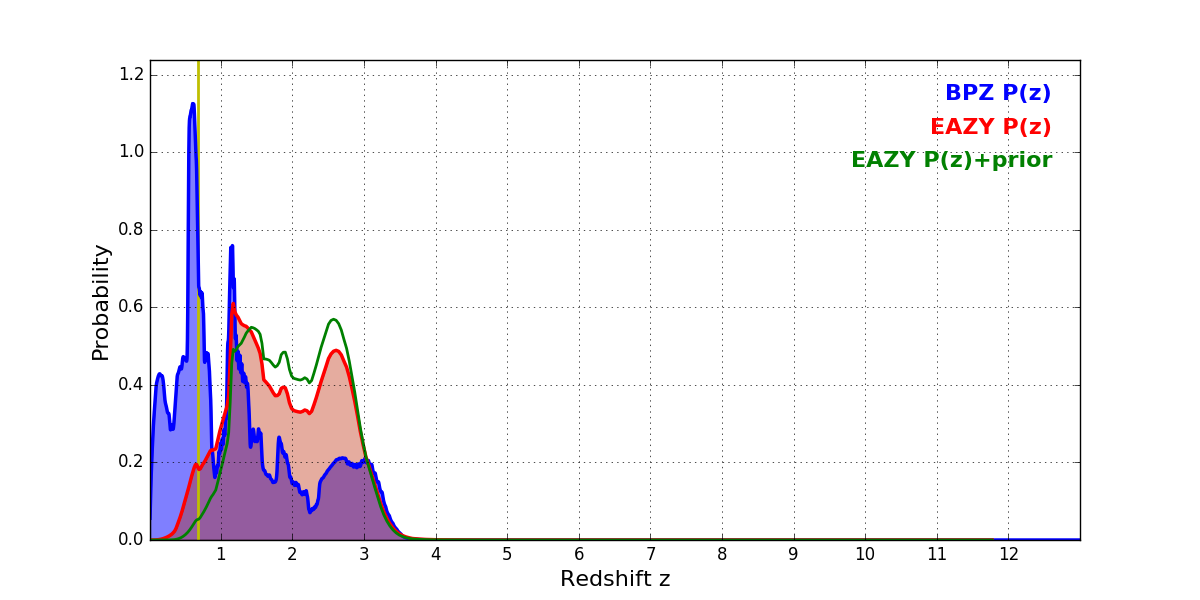 In P(z) plots: Yellow lines mark the cluster redshift z = 0.677,