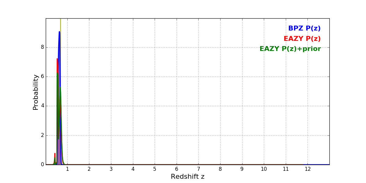 In P(z) plots: Yellow lines mark the cluster redshift z = 0.677,