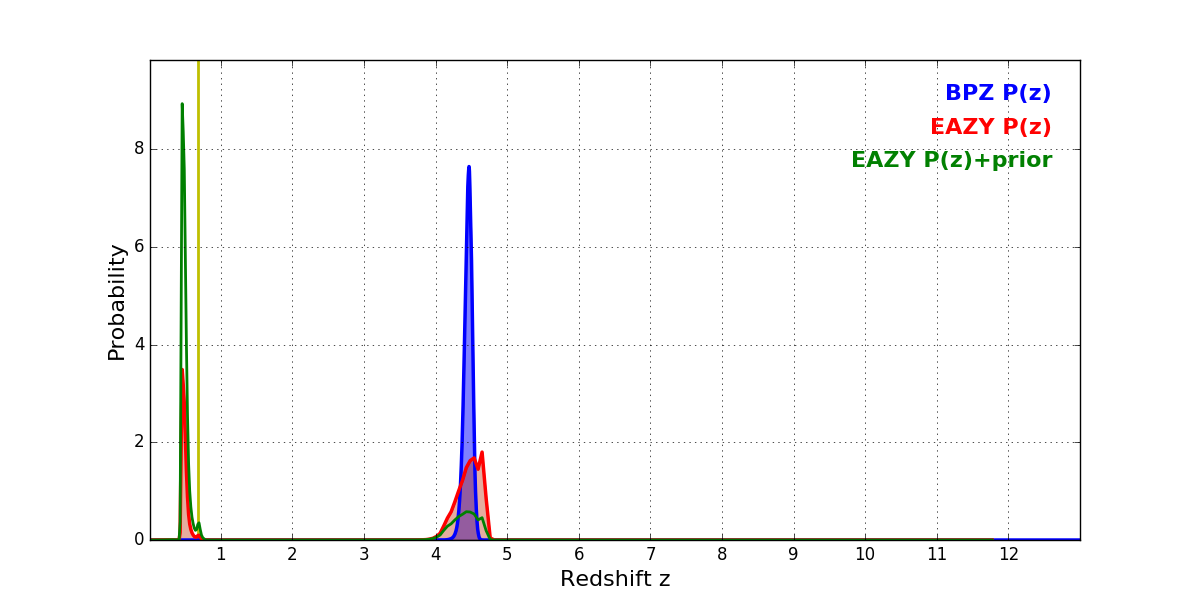 In P(z) plots: Yellow lines mark the cluster redshift z = 0.677,