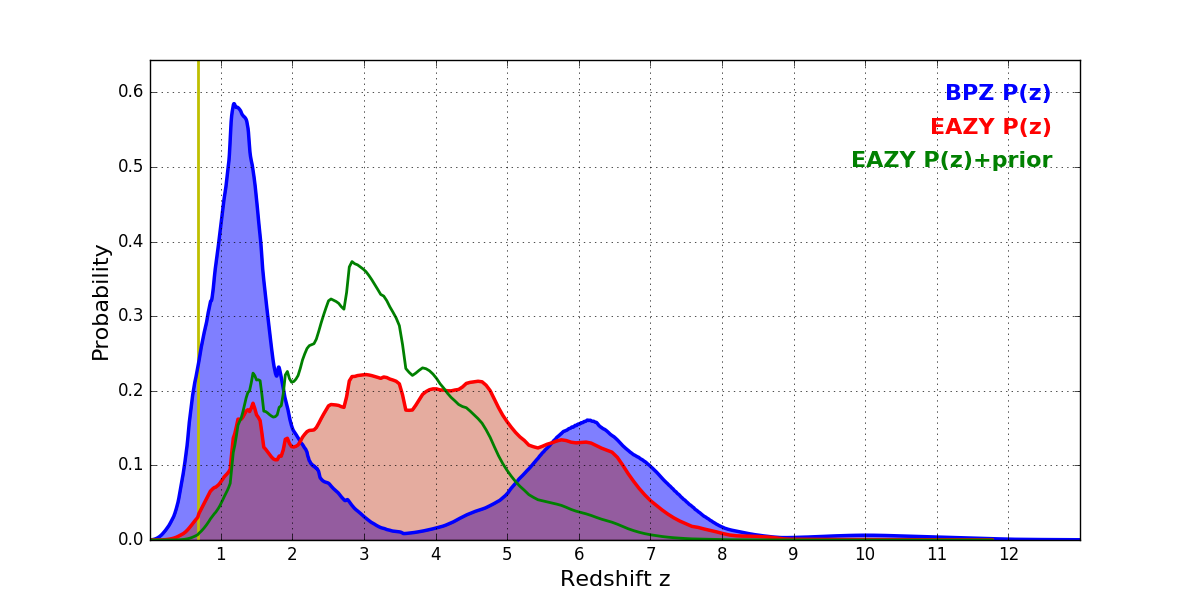 In P(z) plots: Yellow lines mark the cluster redshift z = 0.677,