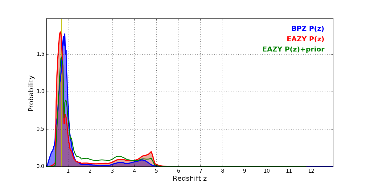 In P(z) plots: Yellow lines mark the cluster redshift z = 0.677,