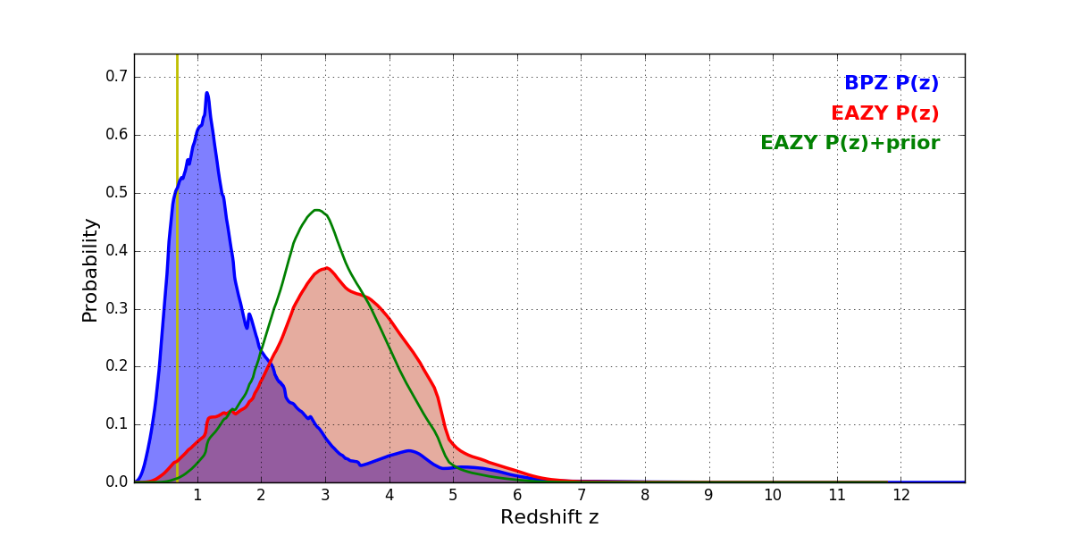 In P(z) plots: Yellow lines mark the cluster redshift z = 0.677,