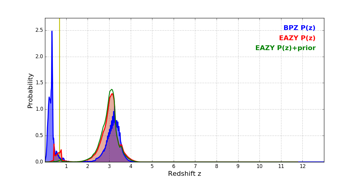 In P(z) plots: Yellow lines mark the cluster redshift z = 0.677,