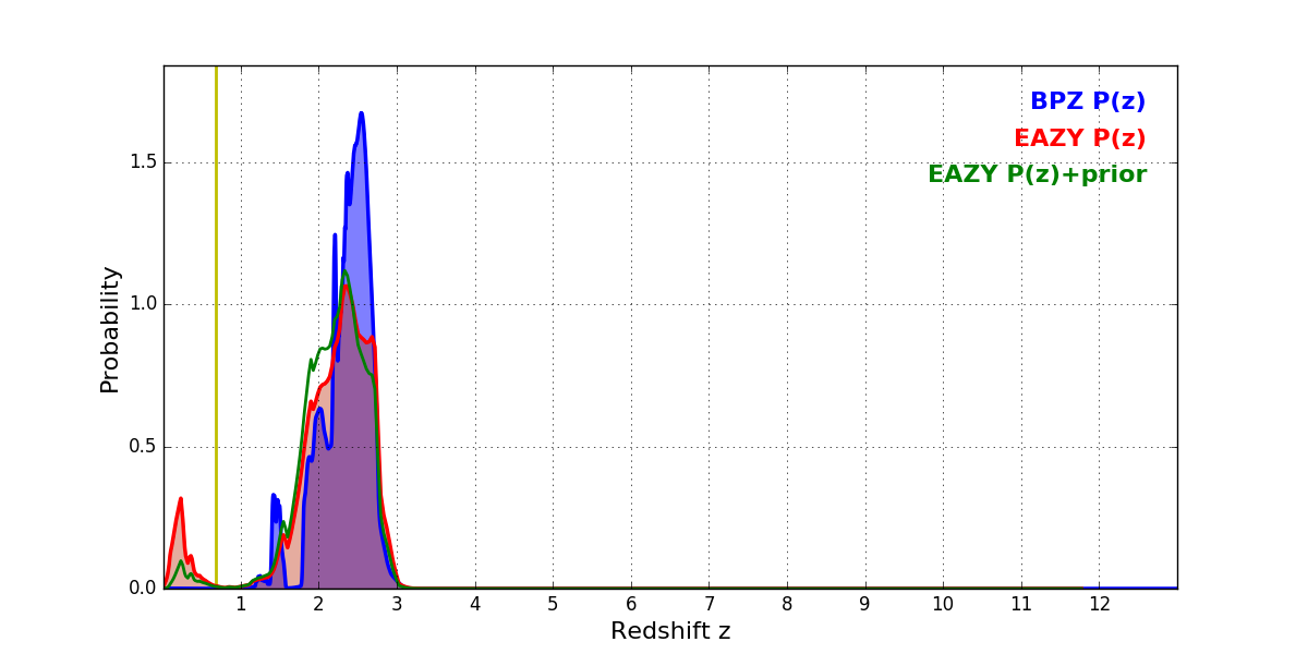 In P(z) plots: Yellow lines mark the cluster redshift z = 0.677,