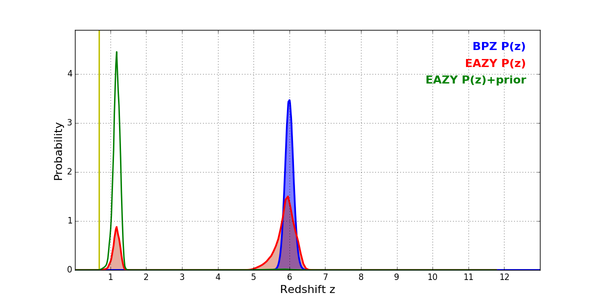 In P(z) plots: Yellow lines mark the cluster redshift z = 0.677,