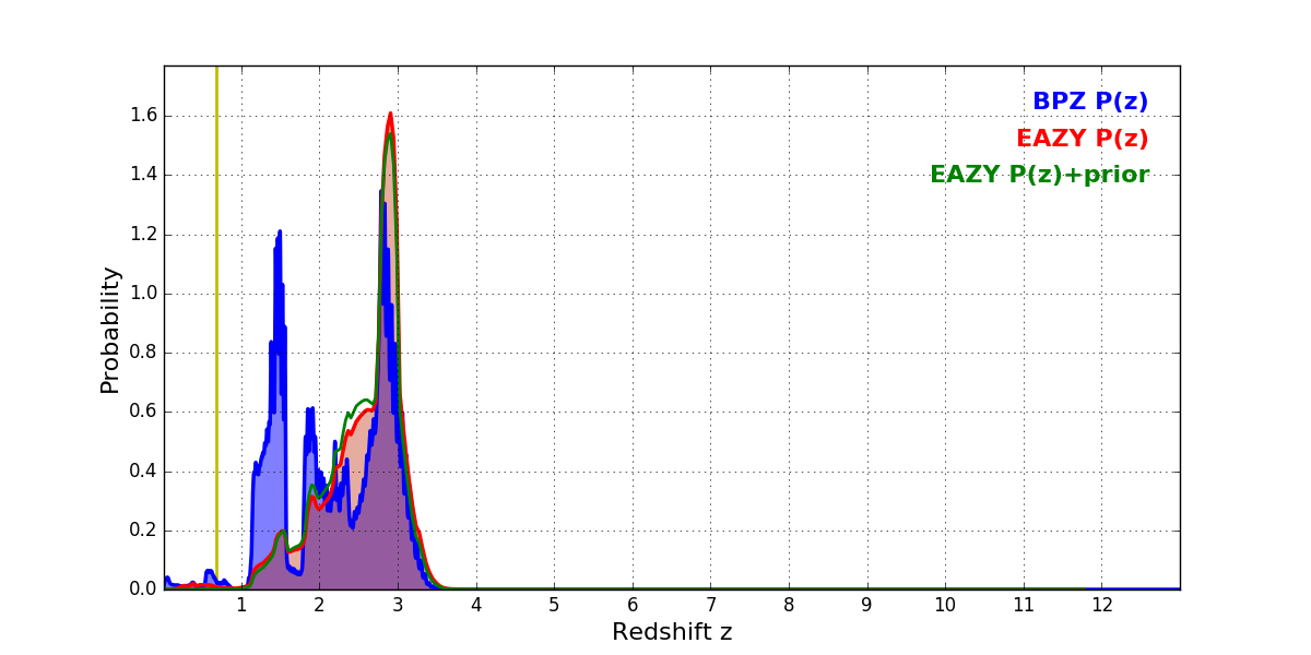 In P(z) plots: Yellow lines mark the cluster redshift z = 0.677,