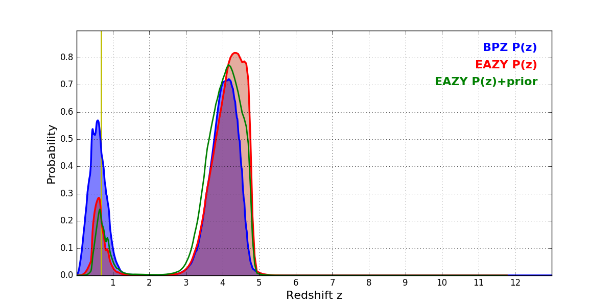 In P(z) plots: Yellow lines mark the cluster redshift z = 0.677,