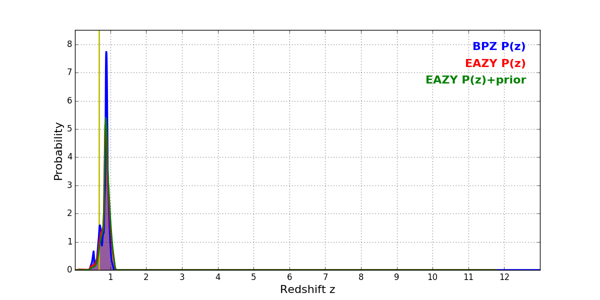 In P(z) plots: Yellow lines mark the cluster redshift z = 0.677,