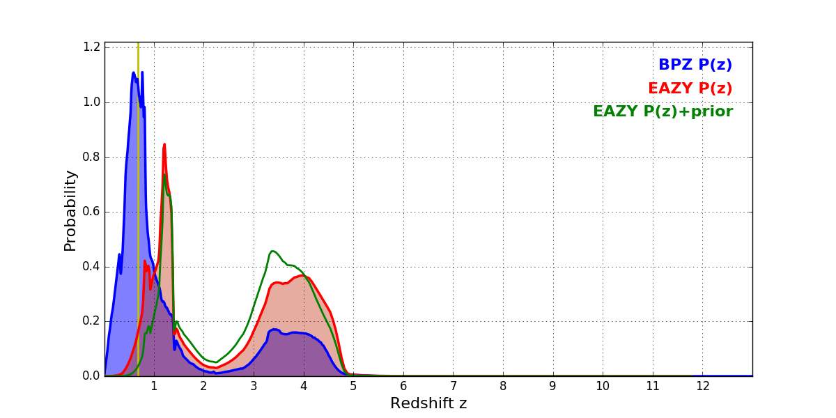 In P(z) plots: Yellow lines mark the cluster redshift z = 0.677,