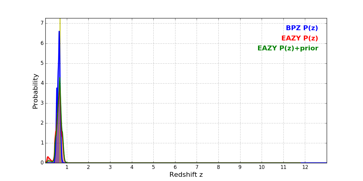 In P(z) plots: Yellow lines mark the cluster redshift z = 0.677,